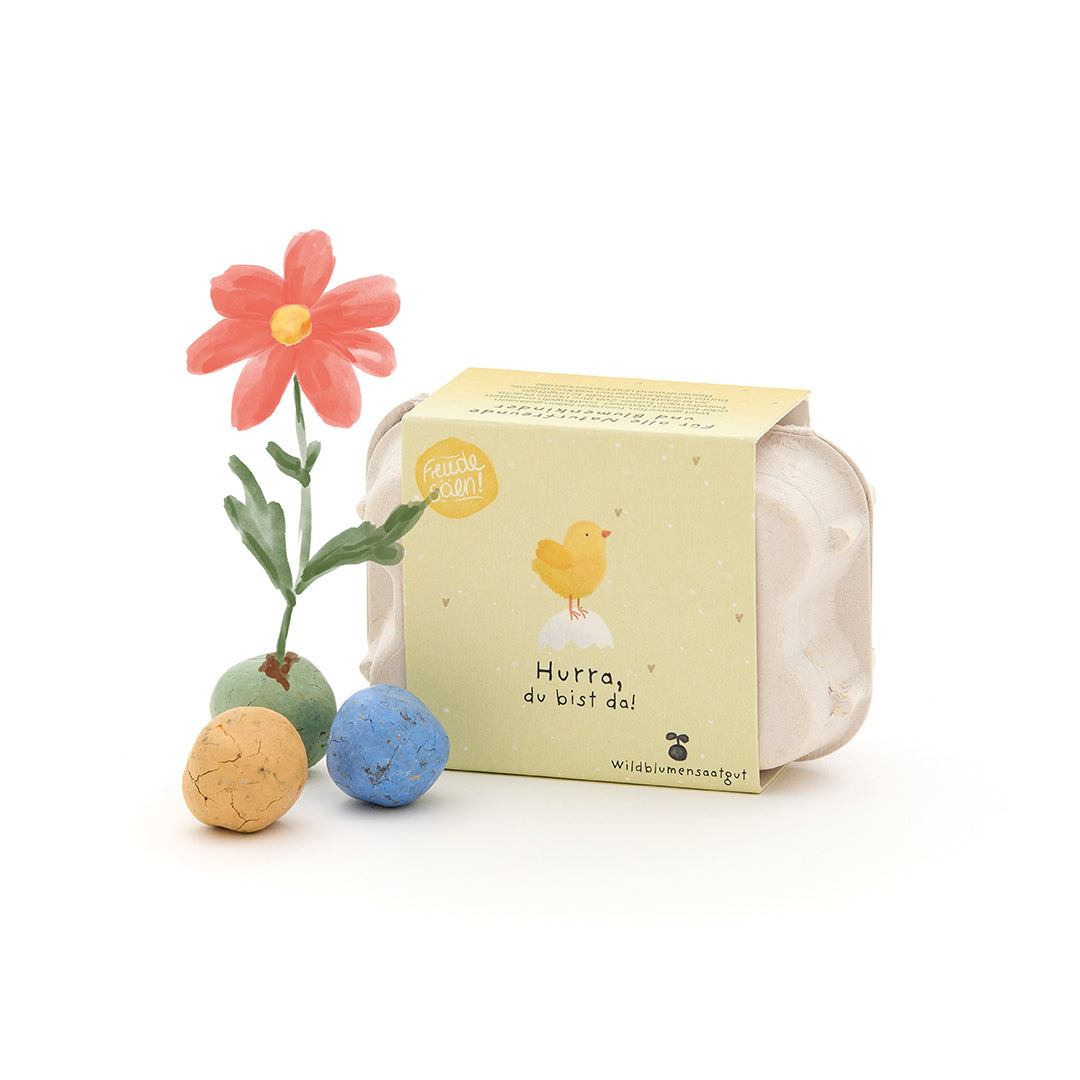 Die Saatkugeln enthalten Wildblumensamen, die drinnen im Topf oder draußen im Garten zu einem farbenfrohen Blütenmeer heranwachsen. Ein besonderes Geschenk, das mit dem Kind wächst und noch lange an diesen besonderen Moment erinnert.