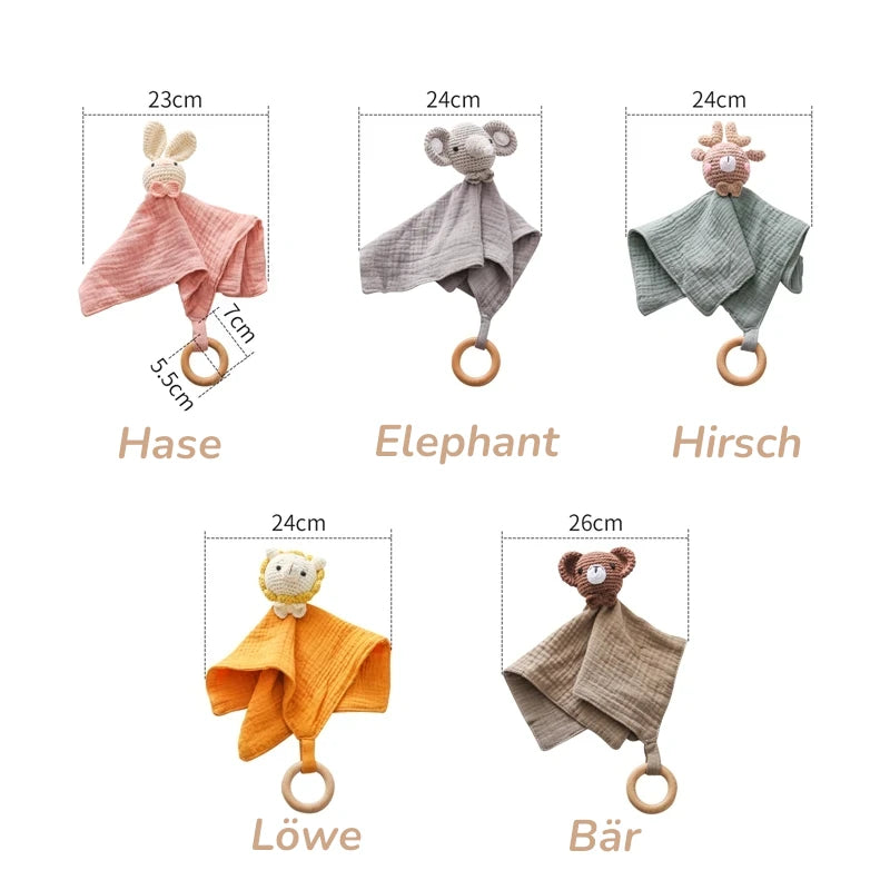 Unsere Schmusetücher sind in einer Vielzahl von Ausführungen erhältlich, darunter niedliche Häschen 🐰, liebenswerte Bären 🐻 und entzückende Elefanten 🐘. Sie sind nicht nur praktisch, sondern auch ein wunderbares Geschenk für Babys und Eltern.