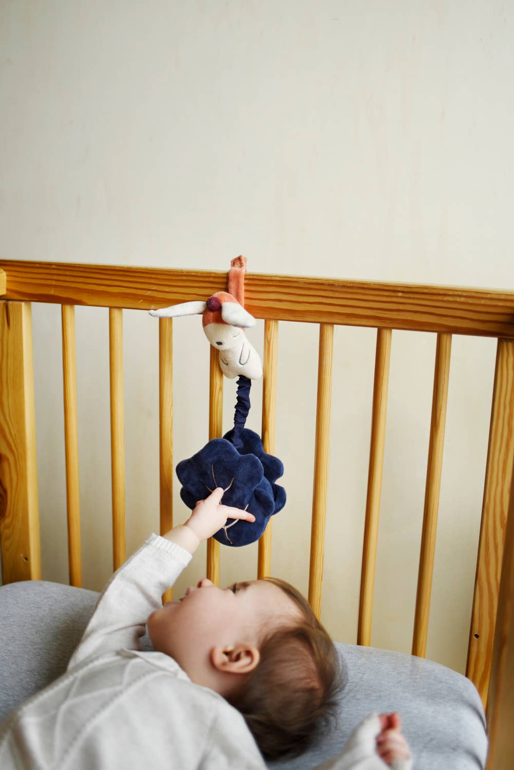 Das kleine Kaninchen versteckt sich praktisch im großen Blatt und sorgt so für zusätzlichen Spielspaß. Dank des Klettverschlusses auf der Rückseite lässt sich die Spieluhr ganz einfach am Babybett, Kinderwagen oder sogar im Auto befestigen.