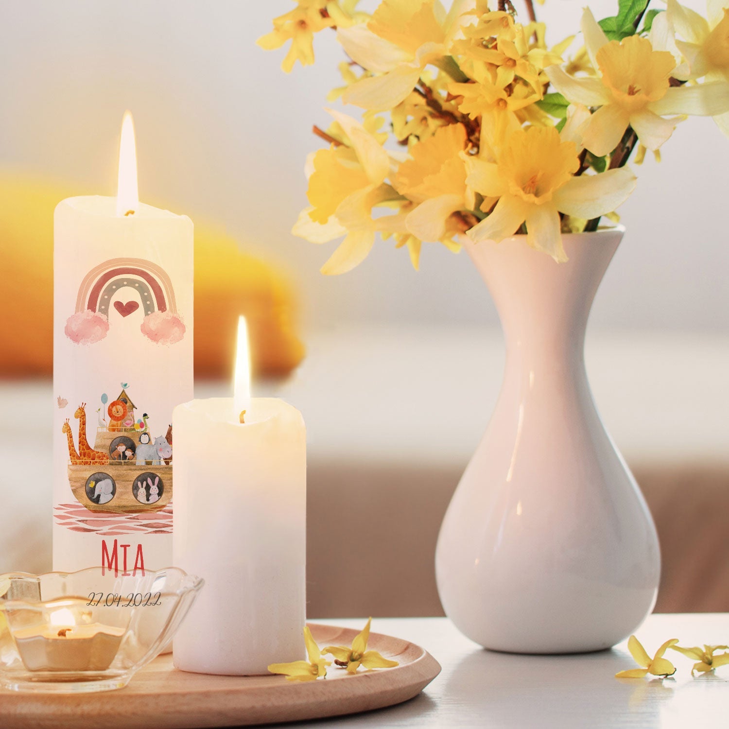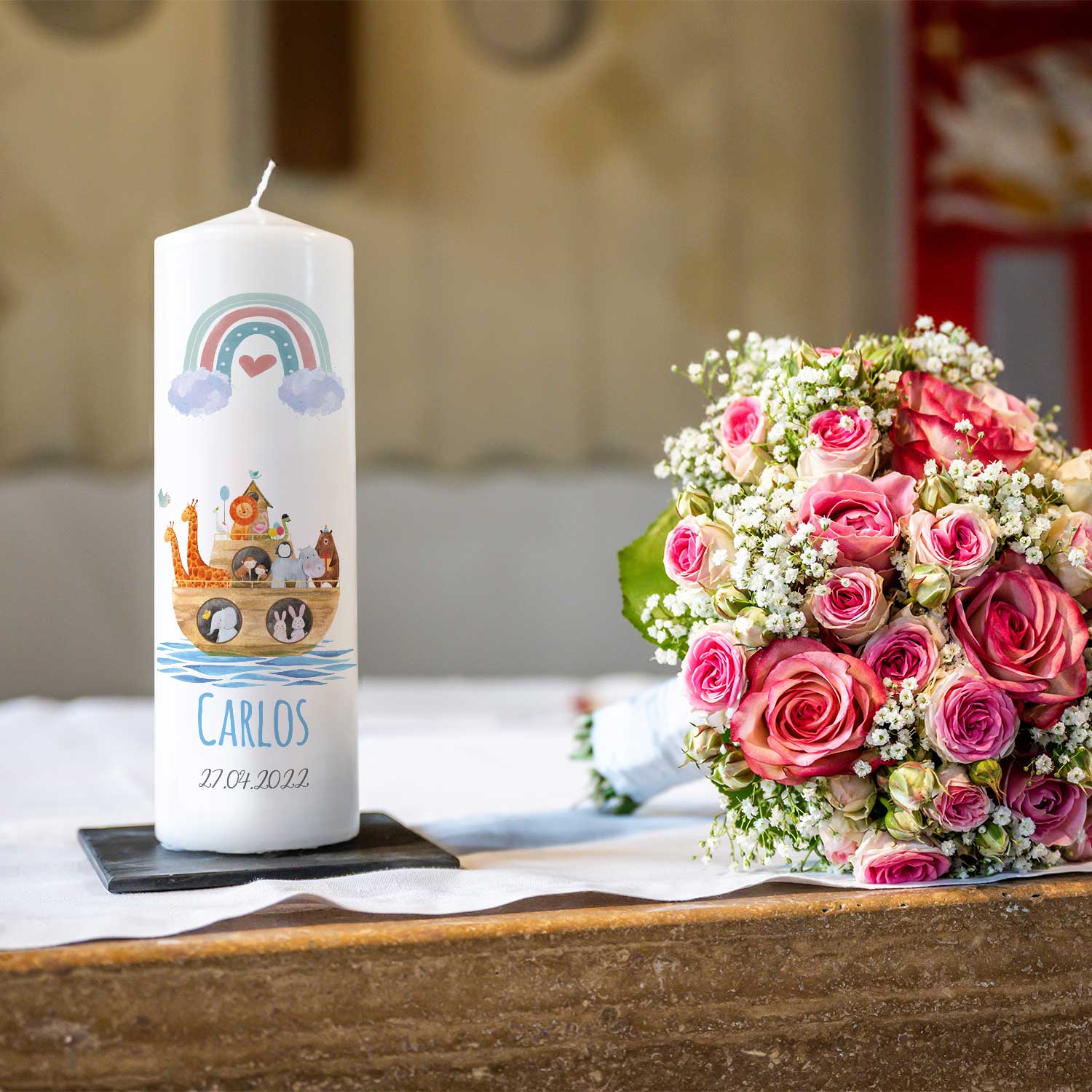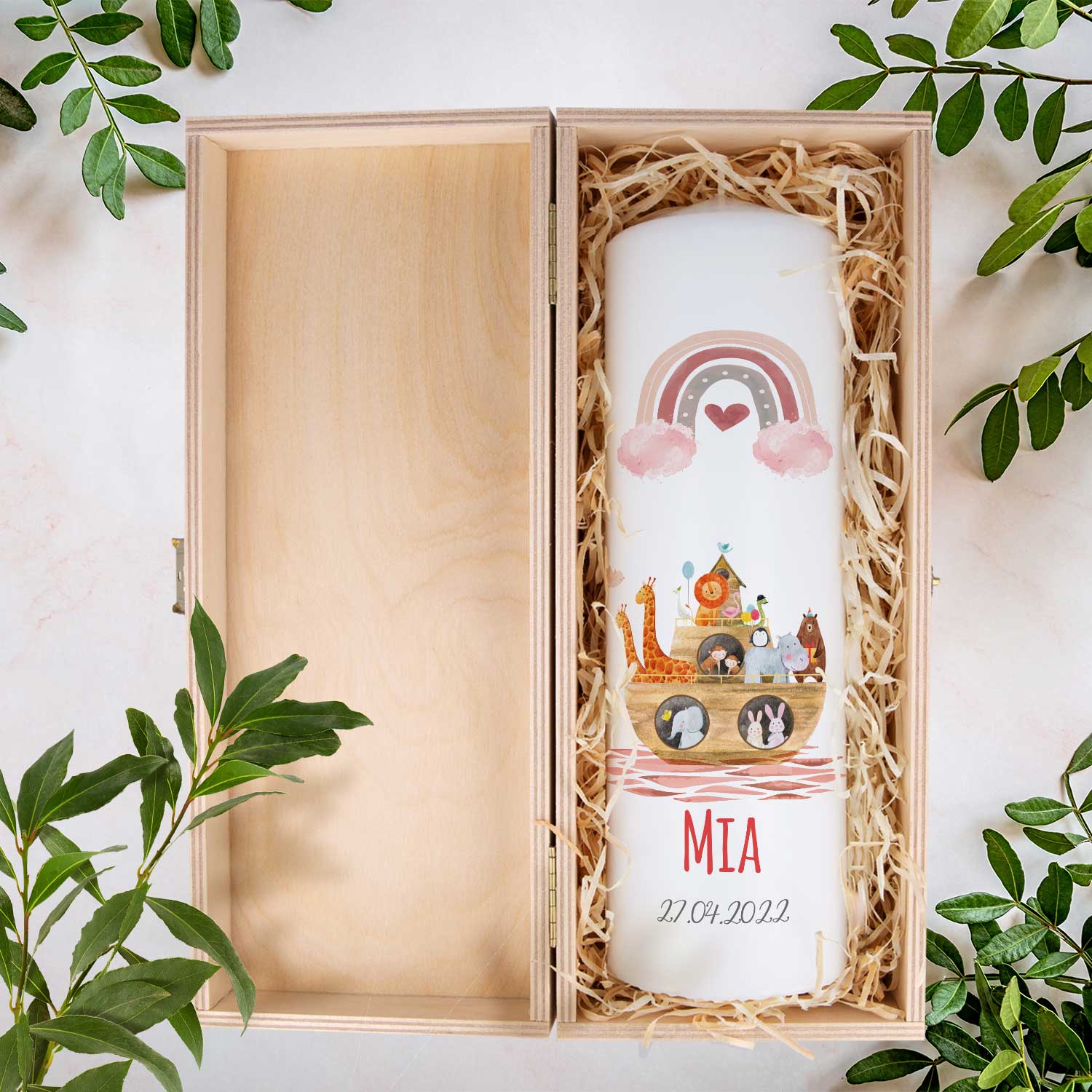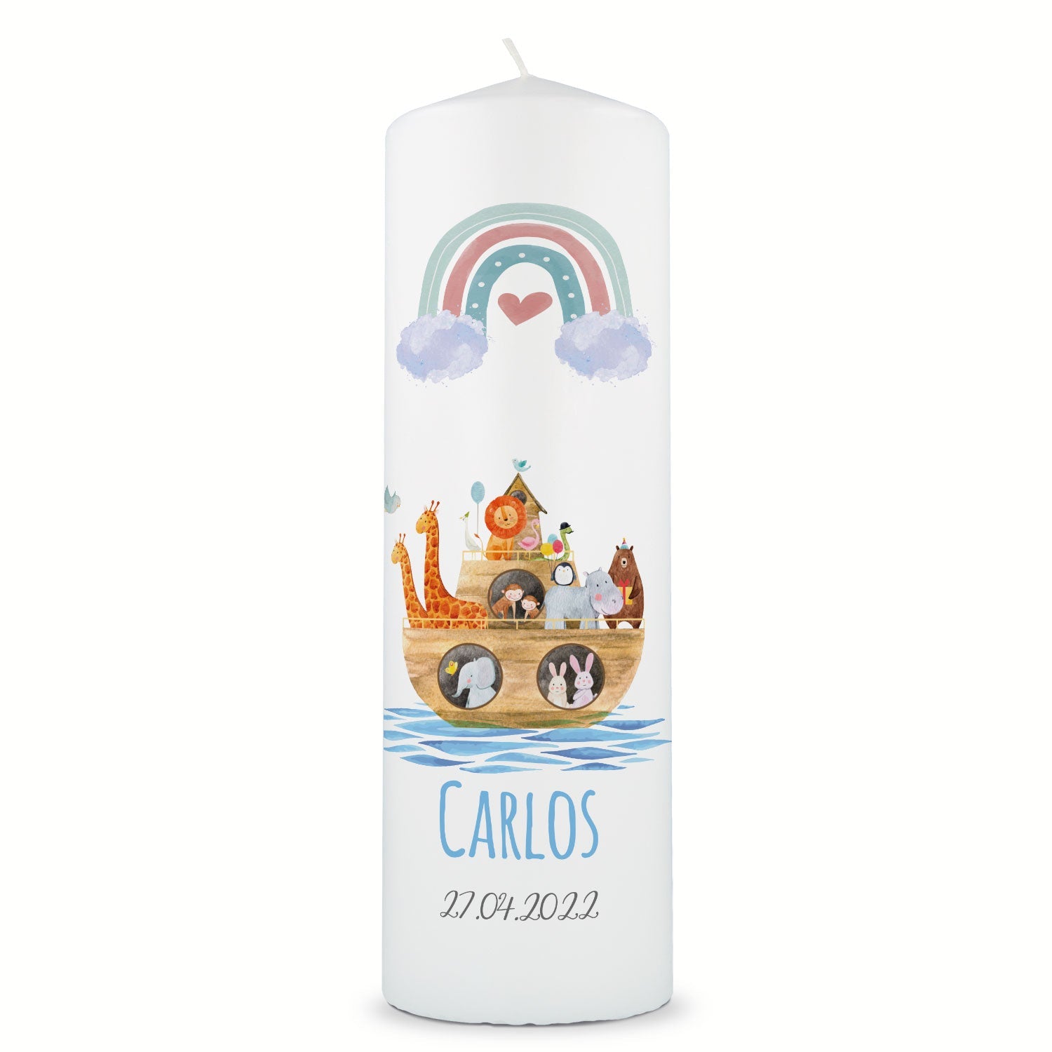 Große Kerze "Arche Regenbogen" - Taufkerze mit Namen, Datum & Wunschtext