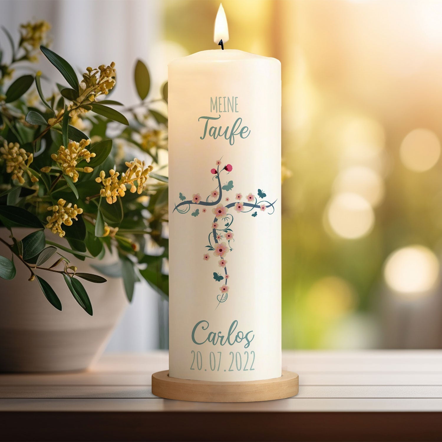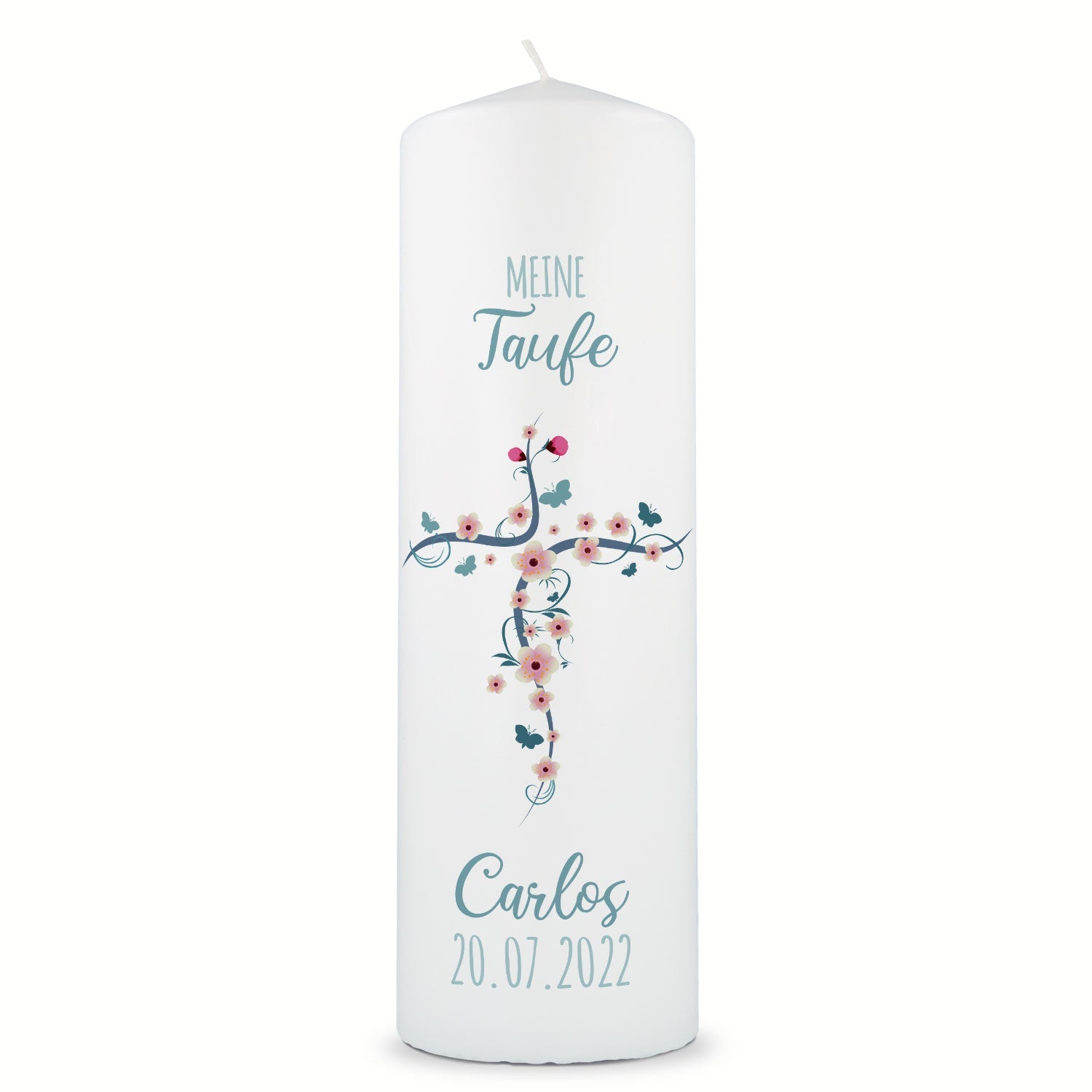 Große Kerze "Blumenkreuz" - Taufkerze mit Namen & Datum