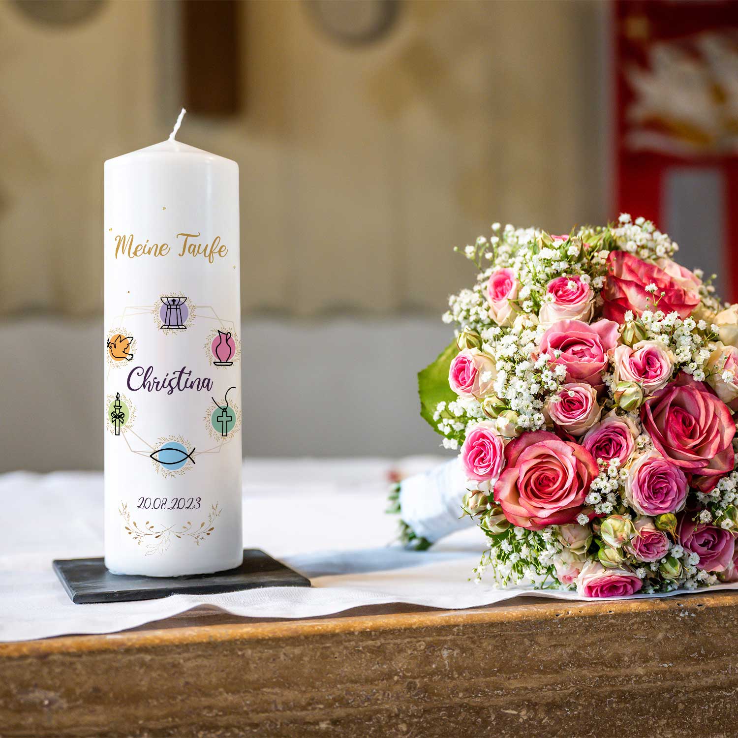Große Kerze "Christliche Symbole" - Taufkerze mit Namen, Datum & Wunschtext