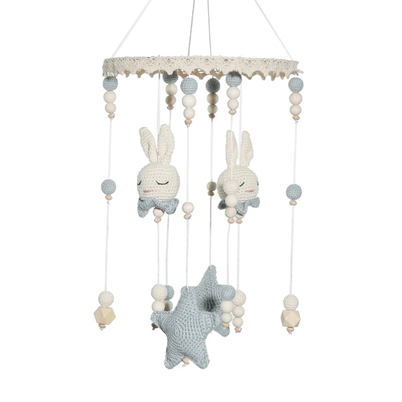 Dieses liebevoll gehäkelte Mobile von KidzzCamp sorgt für beruhigende Momente und sanfte Unterhaltung im Babybett oder über der Wickelkommode. Die niedlichen Häkeltiere – Hase 🐰, Bär 🐻 und Löwe 🦁 – schwingen sanft in der Luft und fördern die visuelle Wahrnehmung sowie die frühkindliche Entwicklung.
