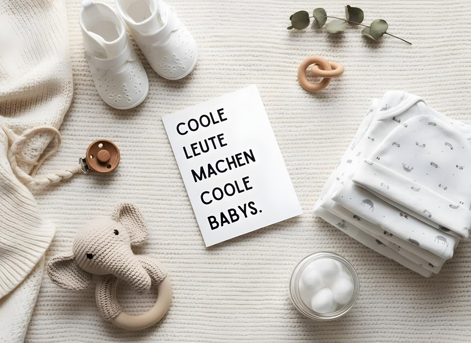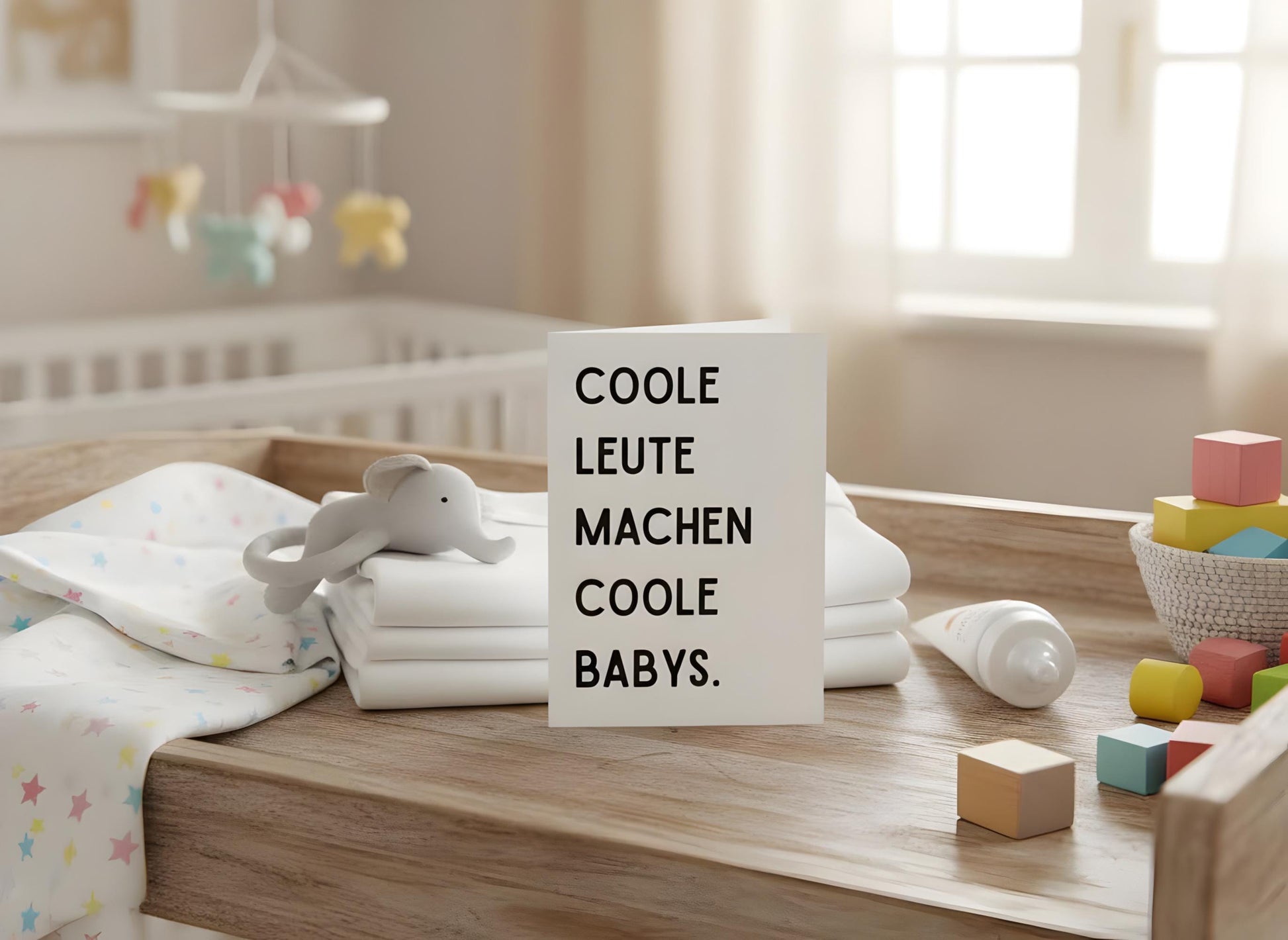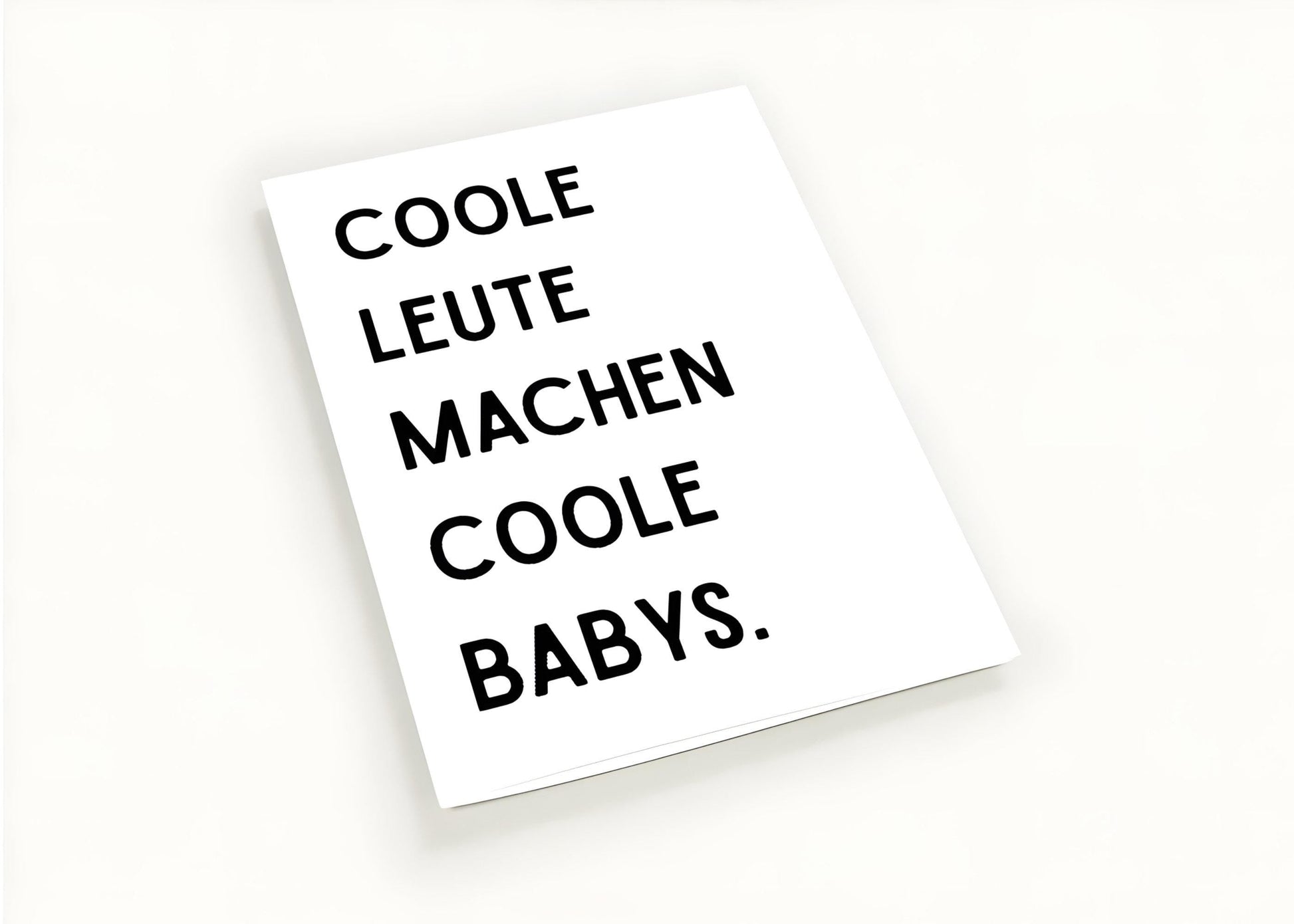Lustige Karte „COOLE LEUTE MACHEN COOLE BABYS.“ ist das perfekte Geschenk, um eine Schwangerschaft zu verkünden oder zur Geburt zu gratulieren. Die schlichte schwarz‑weiße Typografie wirkt modern und passt ideal zu allen, die Humor und klaren Stil lieben.